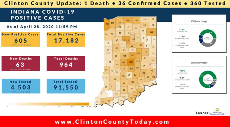 The Indiana State Department of Health (ISDH) announced today, Wednesday, April 29, 2020, Clinton County has now had 36 residents test positive for COVID-19. The one (1) new case is a female in the (40-49) age group. There is 1 death related to COVID-19 in Clinton County. At least 360 residents of Clinton County have been tested as reported by the ISDH.