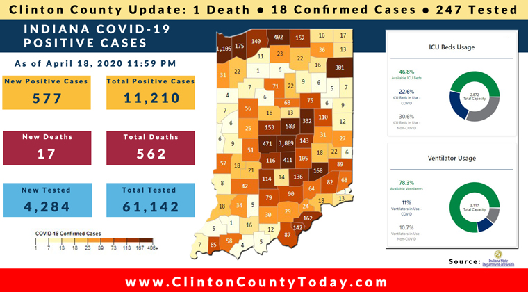 There is 1 death related to COVID-19 in Clinton County as of Sunday, April 19, 2020, 18 have tested positive for COVID-19 and at least 247 Residents of Clinton County have been tested as reported by the Indiana State Department of Health (ISDH).