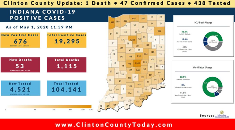 The Indiana State Department of Health (ISDH) announced today, Saturday, May 2, 2020, Clinton County has now had 47 residents test positive for COVID-19. The two (2) new cases reported include a previously unreported case from April 26, 2020. Of the 2 new cases, 1 is a female and 1 is a male. The 1 female is in the (40-49) age group. The male (case from April 26) is in the (40-49) age group. There is 1 death related to COVID-19 in Clinton County. At least 412 residents of Clinton County have been tested as reported by the ISDH.