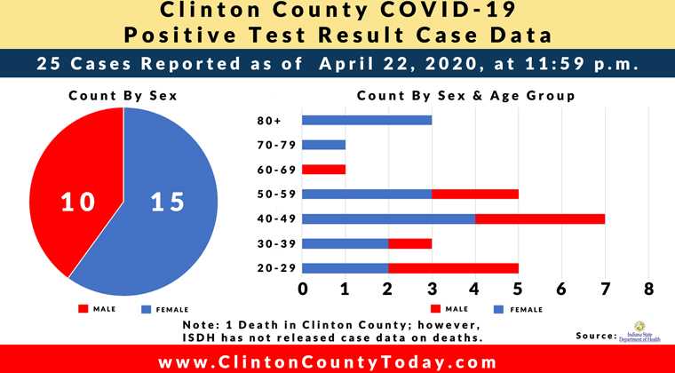 As of Wednesday, April 22, 2020, at 11:59 p.m., Clinton County had 25 residents test positive for COVID-19.
