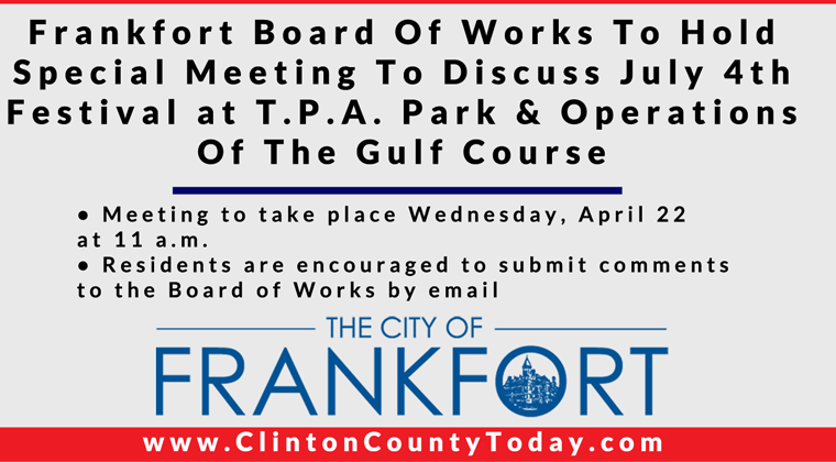 The Frankfort Board of Works will be holding a special meeting on Wednesday, April 22, at 11 a.m. to discuss operations of the golf course and plans for the July 4 Festival at T.P.A. park.