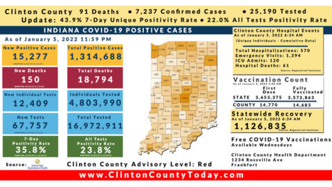 INDIANAPOLIS, Ind. – The Indiana State Department of Health (ISDH) announced today, Friday, January 7, 2022, Clinton County had 86 additional residents tested positive for COVID-19, 7,323 residents in total have tested positives for COVID-19. There are now 91 deaths related to COVID-19 in Clinton County. At least 109,672 total tests have been administered to… Keep Reading