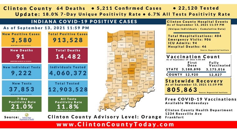 Update (9/14/21): 1 New Death and 15 Additional Clinton County Residents Tested Positive For COVID-19 As Reported By The ISDH