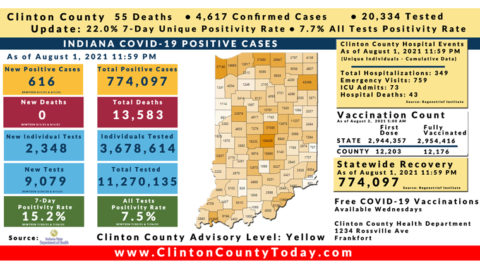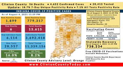INDIANAPOLIS, Ind. – The Indiana State Department of Health (ISDH) announced today, Friday, August 6, 2021, Clinton County had 28 new residents test positive for COVID-19, 4,680 residents in total have tested positives for COVID-19. There are 56 deaths related to COVID-19 in Clinton County. At least 72,919 total tests have been administered to residents… Keep Reading