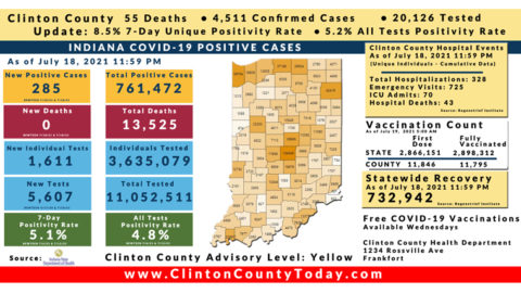 Update (7/26/21): 5 New Clinton County Residents Tested Positive For COVID-19 As Reported By The ISDH