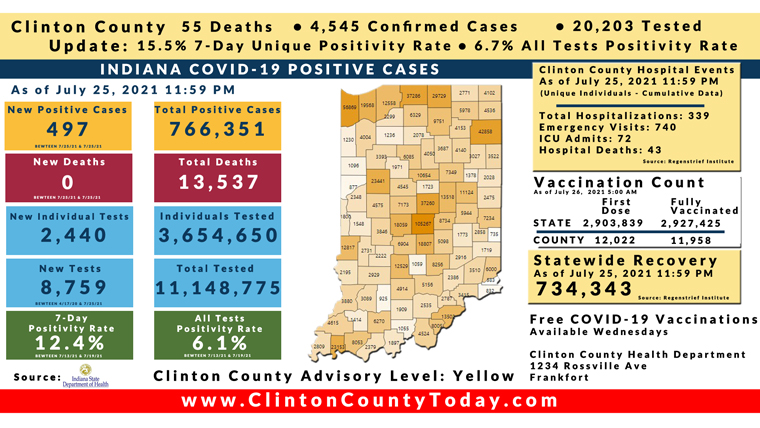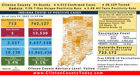 INDIANAPOLIS, Ind. – The Indiana State Department of Health (ISDH) announced today, Monday, July 26, 2021, Clinton County had 5 new residents test positive for COVID-19, 4,545 residents in total have tested positive for COVID-19. There are 55 deaths related to COVID-19 in Clinton County. At least 70,351 total tests have been administered to residents… Keep Reading
