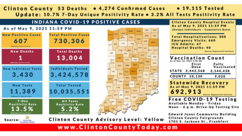 INDIANAPOLIS, Ind. – The Indiana State Department of Health (ISDH) announced today, Sunday, May 16, 2021, Clinton County had 1 new resident who tested positive for COVID-19, 4,284 residents in total have tested positive for COVID-19. There are 53 deaths related to COVID-19 in Clinton County. At least 63,721 total tests have been administered to… Keep Reading