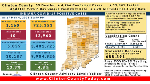 INDIANAPOLIS, Ind. – The Indiana State Department of Health (ISDH) announced today, Thursday, May 6, 2021, Clinton County had 2 new residents who tested positive for COVID-19, 4,268 residents in total have tested positive for COVID-19. There are 53 deaths related to COVID-19 in Clinton County. At least 62,348 total tests have been administered to… Keep Reading