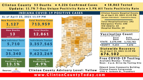 INDIANAPOLIS, Ind. – The Indiana State Department of Health (ISDH) announced today, Sunday, April 25, 2021, Clinton County had 1 new resident who tested positive for COVID-19, 4,227 residents in total have tested positive for COVID-19. There are 53 deaths related to COVID-19 in Clinton County. At least 60,621 total tests have been administered to… Keep Reading