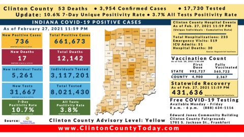 INDIANAPOLIS, Ind. – The Indiana State Department of Health (ISDH) announced today, Sunday, March 7, 2021, Clinton County had 1 new resident who tested positive for COVID-19, 3,976 residents in total have tested positive for COVID-19. There are 53 deaths related to COVID-19 in Clinton County. At least 53,566 total tests have been administered to… Keep Reading