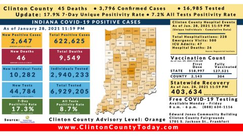 INDIANAPOLIS, Ind. – The Indiana State Department of Health (ISDH) announced today, Friday, February 5, 2021, Clinton County had 1 new death related to COVID-19 and 7 new residents who tested positive for COVID-19, 3,851 residents in total have tested positive for COVID-19. There are now 49 deaths related to COVID-19 in Clinton County. At… Keep Reading