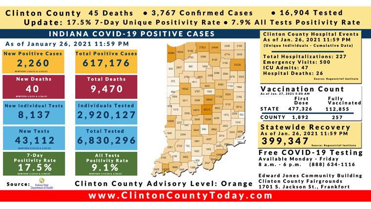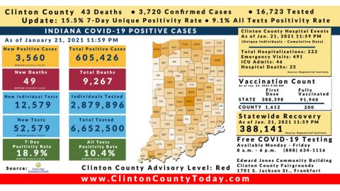 INDIANAPOLIS, Ind. – The Indiana State Department of Health (ISDH) announced today, Wednesday, January 27, 2021, Clinton County recorded 9 new residents who tested positive for COVID-19, 3,767 residents in total have tested positive for COVID-19. There are 45 deaths related to COVID-19 in Clinton County. At least 45,923 total tests have been administered to… Keep Reading