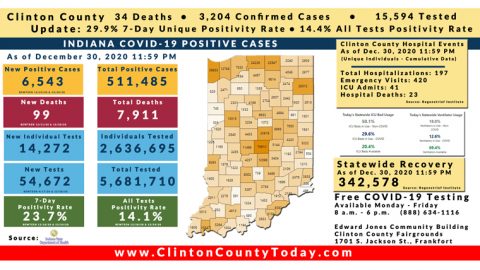 INDIANAPOLIS, Ind. – The Indiana State Department of Health (ISDH) announced today, Friday, January 8, 2021, Clinton County recorded 1 new death and 22 new residents tested positive for COVID-19, 3,455 residents in total have tested positive for COVID-19. There are now 36 deaths related to COVID-19 in Clinton County. At least 41,007 total tests… Keep Reading