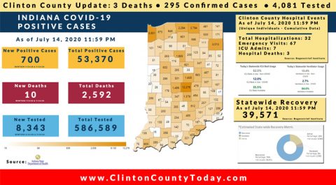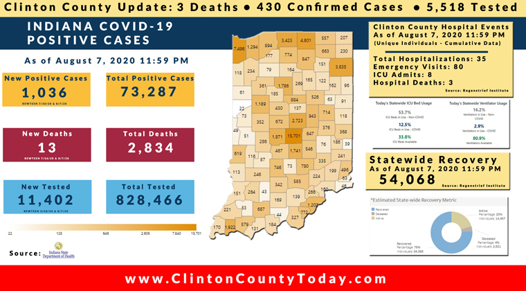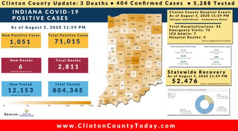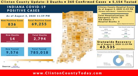 The Indiana State Department of Health (ISDH) announced today Saturday, August 8, 2020, Clinton County has had 430 residents test positive for COVID-19. There are 3 deaths related to COVID-19 in Clinton County. At least 5,518 residents of Clinton County have been tested as reported by the ISDH. The rolling 7-day positivity rate for Clinton… Keep Reading