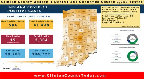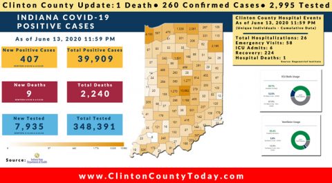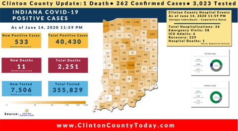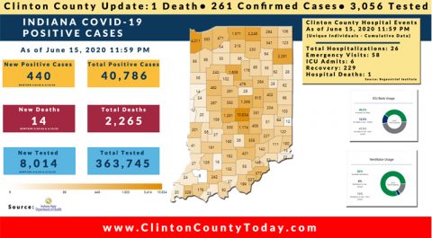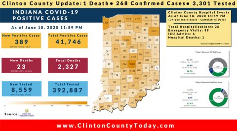 The Indiana State Department of Health (ISDH) announced today, Saturday, June 20, 2020, Clinton County has now had 269 residents test positive for COVID-19. There is 1 death related to COVID-19 in Clinton County. At least 3,336 residents of Clinton County have been tested as reported by the ISDH. Additionally, the ISDH announced that 411… Keep Reading