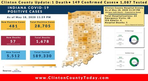 The Indiana State Department of Health (ISDH) announced today, Tuesday, May 19, 2020, Clinton County has now had 149 residents test positive for COVID-19. There is 1 death related to COVID-19 in Clinton County. At least 1,087 residents of Clinton County have been tested as reported by the ISDH. Additionally, the ISDH announced that 481… Keep Reading