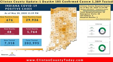 The Indiana State Department of Health (ISDH) announced today, Thursday, May 21, 2020, Clinton County has now had 185 residents test positive for COVID-19. There is 1 death related to COVID-19 in Clinton County. At least 1,389 residents of Clinton County have been tested as reported by the ISDH. Additionally, the ISDH announced that 676… Keep Reading