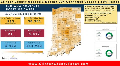 The Indiana State Department of Health (ISDH) announced today, Saturday, May 23, 2020, Clinton County has now had 204 residents test positive for COVID-19. There is 1 death related to COVID-19 in Clinton County. At least 1,604 residents of Clinton County have been tested as reported by the ISDH. Additionally, the ISDH announced that 513… Keep Reading