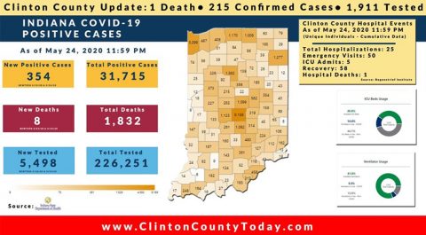 The Indiana State Department of Health (ISDH) announced today, Monday, May 25, 2020, Clinton County has now had 215 residents test positive for COVID-19. There is 1 death related to COVID-19 in Clinton County. At least 1,911 residents of Clinton County have been tested as reported by the ISDH. Additionally, the ISDH announced that 354… Keep Reading