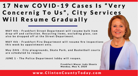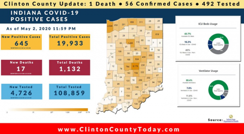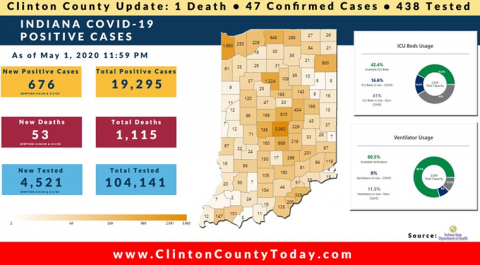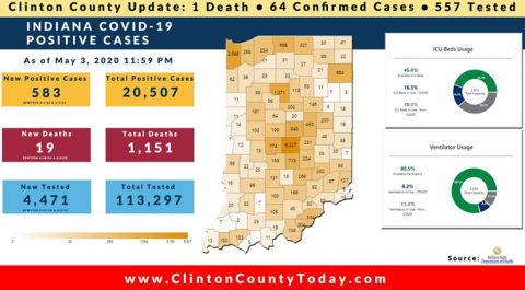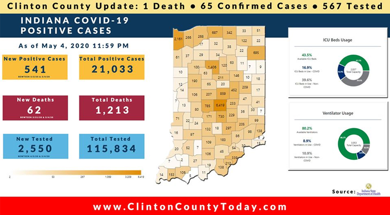 The Indiana State Department of Health (ISDH) announced today, Tuesday, May 5, 2020, Clinton County has now had 65 residents test positive for COVID-19. The one (1) new case reported was a female in the (40-49) age group. There is 1 death related to COVID-19 in Clinton County. At least 567 residents of Clinton County… Keep Reading