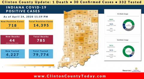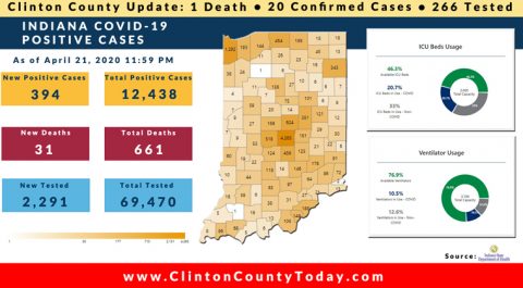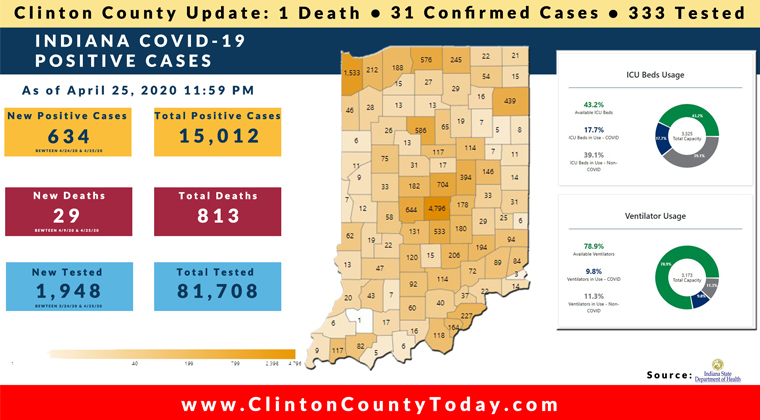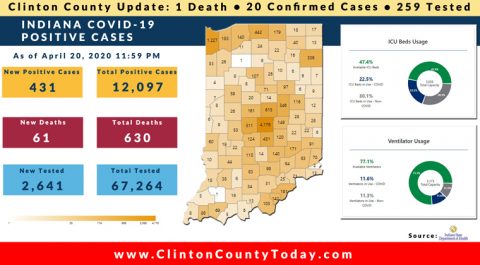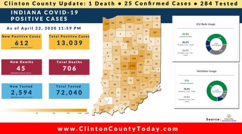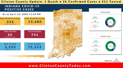 The Indiana State Department of Health (ISDH) announced today, Sunday, April 26, 2020, Clinton County has now had 31 residents test positive for COVID-19. The one (1) new case is a male in the (40-49) age group. There is 1 death related to COVID-19 in Clinton County. At least 333 Residents of Clinton County have… Keep Reading