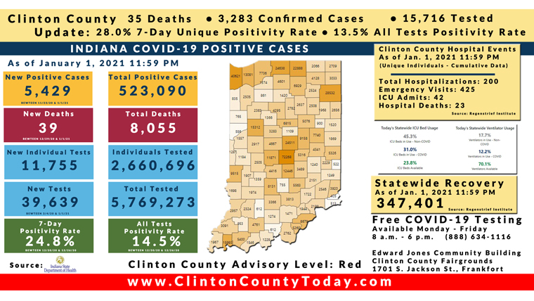 INDIANAPOLIS, Ind. – The Indiana State Department of Health (ISDH) announced today, Saturday, January 2, 2021, Clinton County recorded 43 new residents tested positive for COVID-19, 3,283 residents in total have tested positive for COVID-19. There are 35 deaths related to COVID-19 in Clinton County. At least 39,721 total tests have been administered to residents of Clinton County, of which 15,716 have been unique tests as reported by the ISDH.