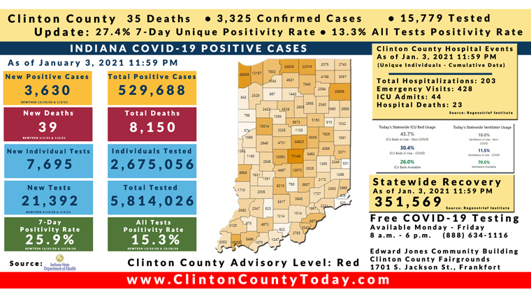 INDIANAPOLIS, Ind. – The Indiana State Department of Health (ISDH) announced today, Monday, January 4, 2021, Clinton County recorded 19 new residents tested positive for COVID-19, 3,325 residents in total have tested positive for COVID-19. There are 35 deaths related to COVID-19 in Clinton County. At least 39,961 total tests have been administered to residents of Clinton County, of which 15,779 have been unique tests as reported by the ISDH.