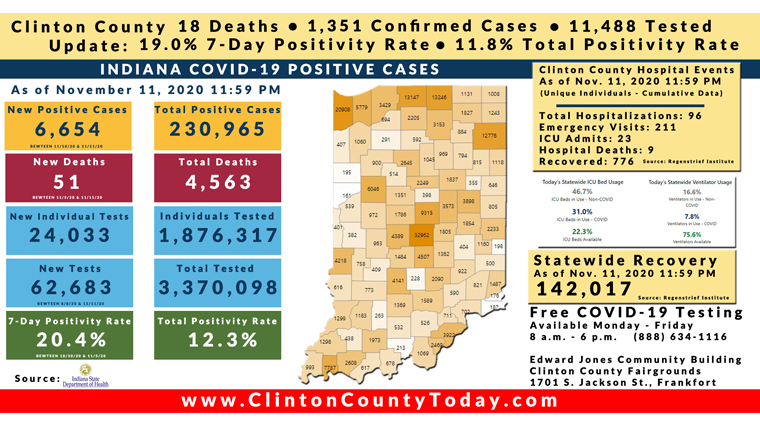 INDIANAPOLIS, Ind. – The Indiana State Department of Health (ISDH) announced today, Thursday, November 12, 2020, Clinton County recorded 21 new residents test positive for COVID-19, 1,351 residents in total have tested positive for COVID-19. There are 18 deaths related to COVID-19 in Clinton County. At least 11,449 unique tests have been administrated to residents of Clinton County as reported by the ISDH.