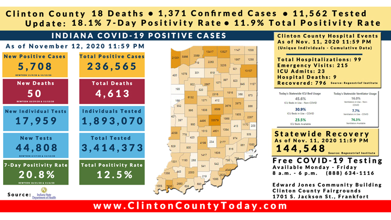 INDIANAPOLIS, Ind. – The Indiana State Department of Health (ISDH) announced today, Friday, November 13, 2020, Clinton County recorded 21 new residents test positive for COVID-19, 1,371 residents in total have tested positive for COVID-19. There are 18 deaths related to COVID-19 in Clinton County. At least 11,562 unique tests have been administrated to residents of Clinton County as reported by the ISDH.