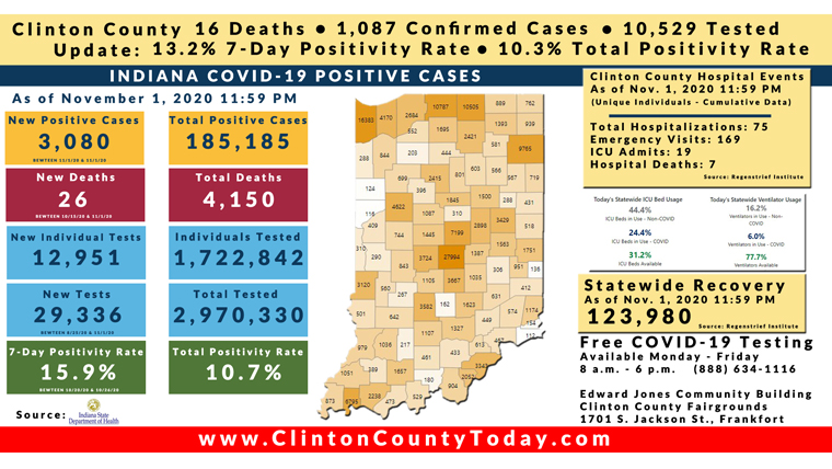 INDIANAPOLIS, Ind – The Indiana State Department of Health (ISDH) announced today, Monday, November 2, 2020, Clinton County had 31 new residents test positive for COVID-19, 1,087 residents in total have tested positive for COVID-19. There are 16 deaths related to COVID-19 in Clinton County. At least 10,529 unique tests have been administrated to residents of Clinton County as reported by the ISDH.