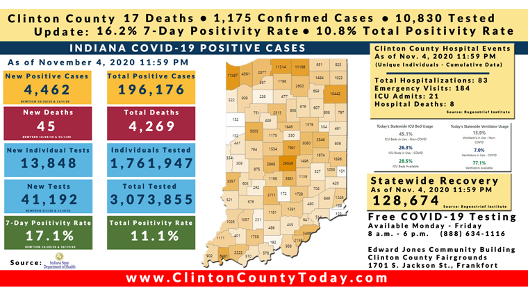 INDIANAPOLIS, Ind. – The Indiana State Department of Health (ISDH) announced today, Thursday, November 5, 2020, Clinton County had 1 new death related to COVID-19, and 47 new residents test positive for COVID-19, 1,175 residents in total have tested positive for COVID-19. There are 17 deaths related to COVID-19 in Clinton County. At least 10,830 unique tests have been administrated to residents of Clinton County as reported by the ISDH.