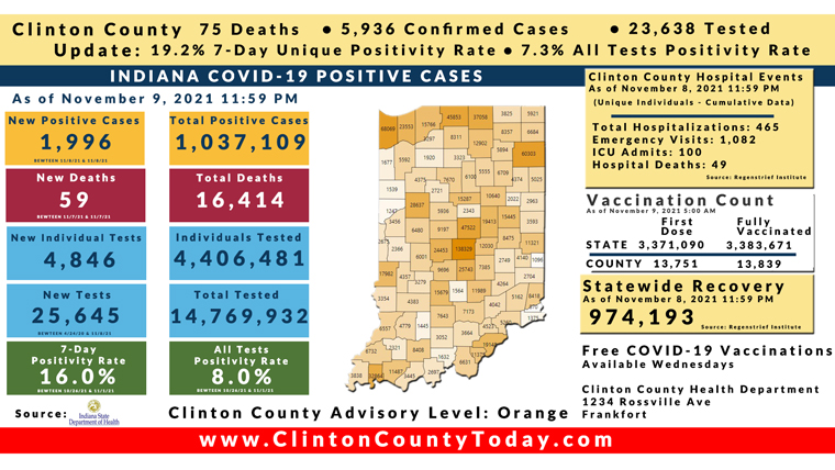 INDIANAPOLIS, Ind. – The Indiana State Department of Health (ISDH) announced today, Tuesday, November 9, 2021, Clinton County had 1 death related to COVID-19 while 11 additional residents test positive for COVID-19, 5,936 residents in total have tested positives for COVID-19. There are now 75 deaths related to COVID-19 in Clinton County. At least 96,914 total tests have been administered to residents of Clinton County, of which 23,623 have been unique tests as reported by the ISDH.