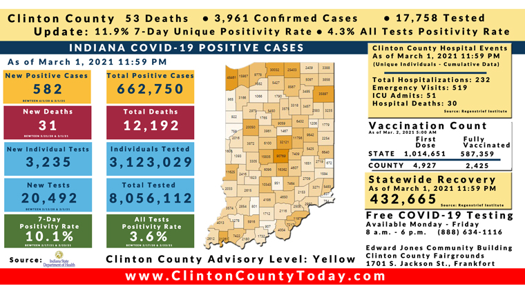 INDIANAPOLIS, Ind. – The Indiana State Department of Health (ISDH) announced today, Tuesday, March 2, 2021, Clinton County had 3 new residents who tested positive for COVID-19, 3,961 residents in total have tested positive for COVID-19. There are 53 deaths related to COVID-19 in Clinton County. At least 52,573 total tests have been administered to residents of Clinton County, of which 17,758 have been unique tests as reported by the ISDH.