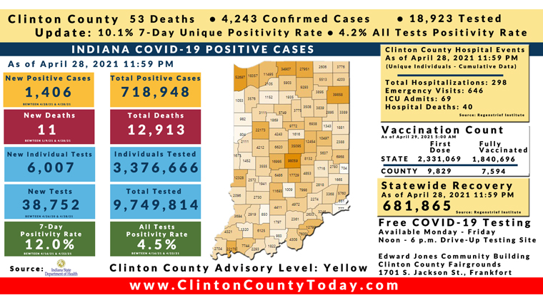 INDIANAPOLIS, Ind. – The Indiana State Department of Health (ISDH) announced today, Thursday, April 29, 2021, Clinton County had 8 new residents who tested positive for COVID-19, 4,243 residents in total have tested positive for COVID-19. There are 53 deaths related to COVID-19 in Clinton County. At least 61,244 total tests have been administered to residents of Clinton County, of which 18,923 have been unique tests as reported by the ISDH.