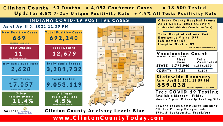 INDIANAPOLIS, Ind. – The Indiana State Department of Health (ISDH) announced today, Tuesday, April 6, 2021, Clinton County had 4 new residents who tested positive for COVID-19, 4,093 residents in total have tested positive for COVID-19. There are 53 deaths related to COVID-19 in Clinton County. At least 57,426 total tests have been administered to residents of Clinton County, of which 18,500 have been unique tests as reported by the ISDH.