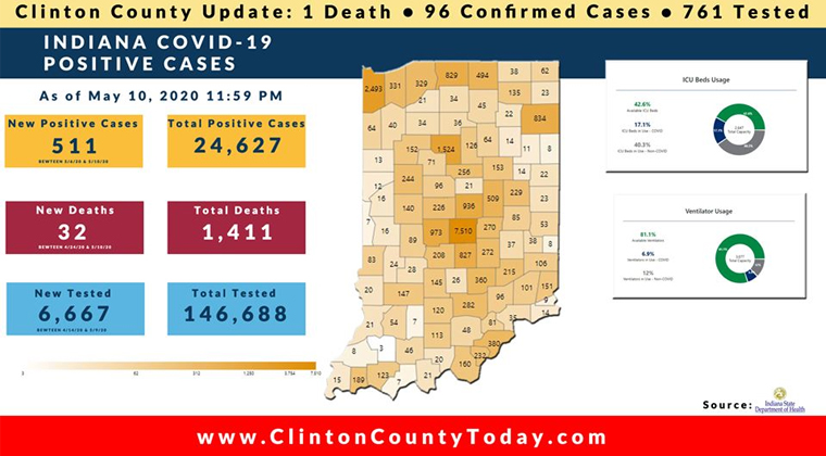 The Indiana State Department of Health (ISDH) announced today, Monday, May 11, 2020, Clinton County has now had 96 residents test positive for COVID-19. There is 1 death related to COVID-19 in Clinton County. At least 761 residents of Clinton County have been tested as reported by the ISDH.