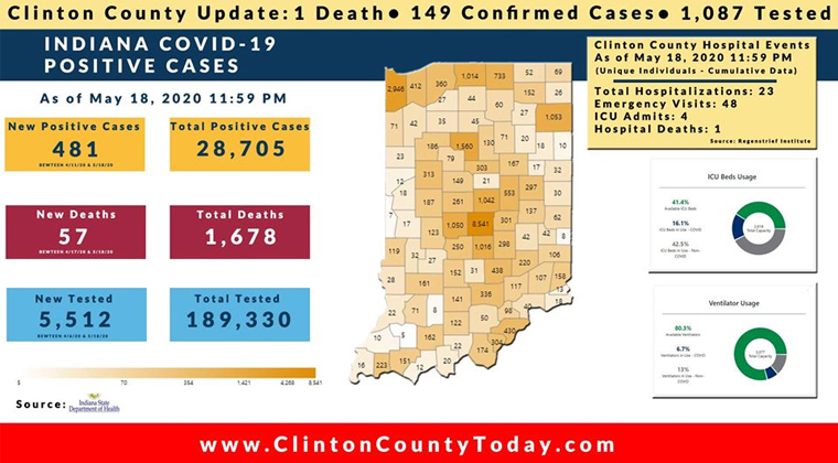 The Indiana State Department of Health (ISDH) announced today, Tuesday, May 19, 2020, Clinton County has now had 149 residents test positive for COVID-19. There is 1 death related to COVID-19 in Clinton County. At least 1,087 residents of Clinton County have been tested as reported by the ISDH.