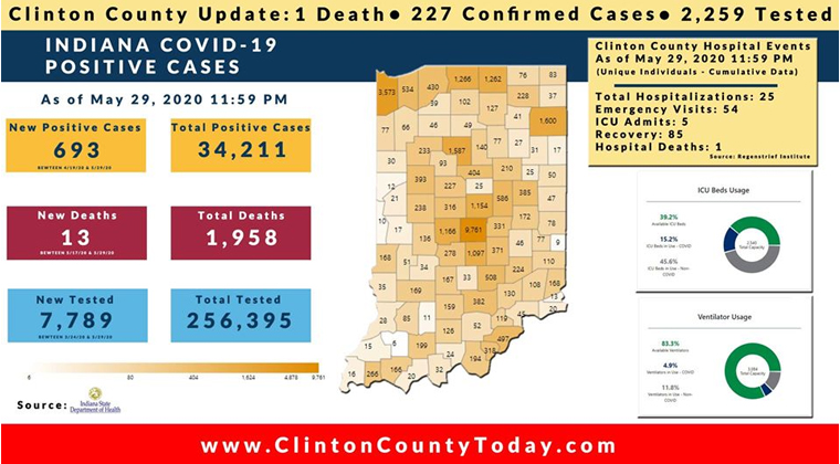 The Indiana State Department of Health (ISDH) announced today, Saturday, May 30, 2020, Clinton County has now had 227 residents test positive for COVID-19. There is 1 death related to COVID-19 in Clinton County. At least 2,259 residents of Clinton County have been tested as reported by the ISDH.