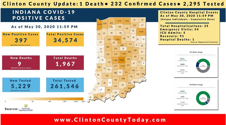 The Indiana State Department of Health (ISDH) announced today, Sunday, May 31, 2020, Clinton County has now had 232 residents test positive for COVID-19. There is 1 death related to COVID-19 in Clinton County. At least 2,295 residents of Clinton County have been tested as reported by the ISDH.