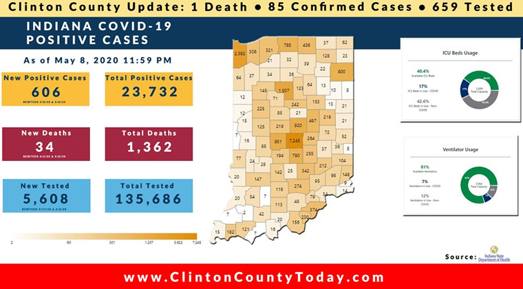 The Indiana State Department of Health (ISDH) announced today, Saturday, May 9, 2020, Clinton County has now had 85 residents test positive for COVID-19. There is 1 death related to COVID-19 in Clinton County. At least 659 residents of Clinton County have been tested as reported by the ISDH.