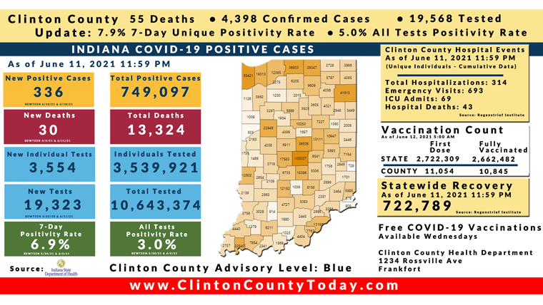 INDIANAPOLIS, Ind. – The Indiana State Department of Health (ISDH) announced today, Saturday, June 12, 2021, Clinton County had 6 new residents who tested positive for COVID-19, 4,398 residents in total have tested positive for COVID-19. There are 55 deaths related to COVID-19 in Clinton County. At least 66,689 total tests have been administered to residents of Clinton County, of which 19,578 have been unique tests as reported by the ISDH.