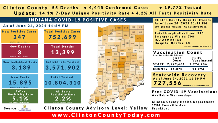 INDIANAPOLIS, Ind. – The Indiana State Department of Health (ISDH) announced today, Friday, June 25, 2021, Clinton County had 5 new residents who tested positive for COVID-19, 4,445 residents in total have tested positive for COVID-19. There are 55 deaths related to COVID-19 in Clinton County. At least 68,071 total tests have been administered to residents of Clinton County, of which 19,772 have been unique tests as reported by the ISDH.