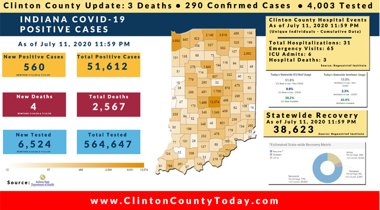 The Indiana State Department of Health (ISDH) announced today, Sunday, July 12, 2020, Clinton County has had 290 residents test positive for COVID-19. There are 3 deaths related to COVID-19 in Clinton County. At least 4,003 residents of Clinton County have been tested as reported by the ISDH.