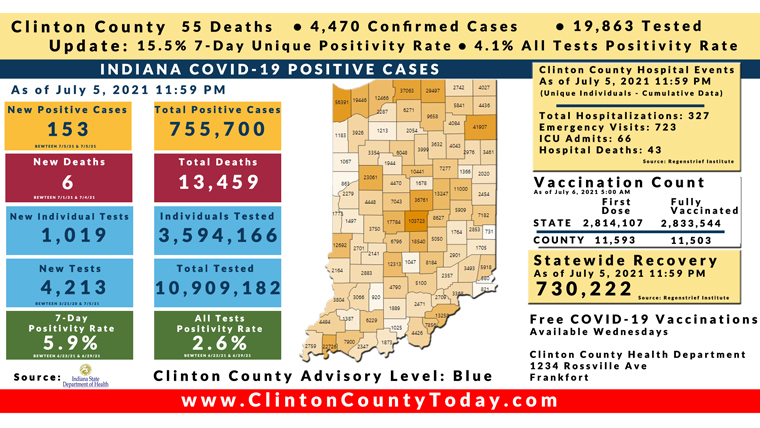 INDIANAPOLIS, Ind. – The Indiana State Department of Health (ISDH) announced today, Tuesday, July 6, 2021, Clinton County had 1 new resident test positive for COVID-19, 4,470 residents in total have tested positive for COVID-19. There are 55 deaths related to COVID-19 in Clinton County. At least 68,755 total tests have been administered to residents of Clinton County, of which 19,863 have been unique tests as reported by the ISDH.
