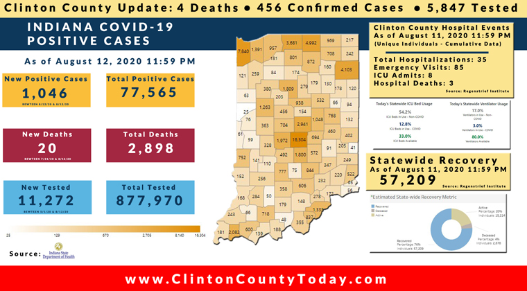 The Indiana State Department of Health (ISDH) announced today, Thursday, August 13, 2020, Clinton County has had 6 additional new positive tests, 456 residents have now tested positive for COVID-19. There are 4 deaths related to COVID-19 in Clinton County. At least 5,847 residents of Clinton County have been tested as reported by the ISDH.