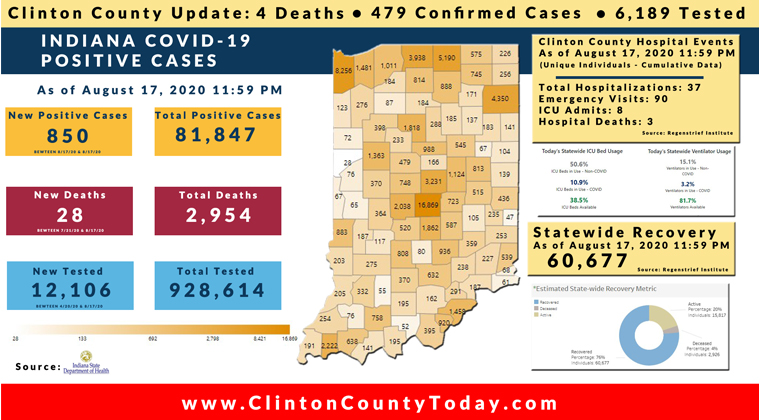 The Indiana State Department of Health (ISDH) announced today, Tuesday, August 18, 2020, Clinton County had 1 new positive test, 479 residents have now tested positive for COVID-19. There are 4 deaths related to COVID-19 in Clinton County. At least 6,189 residents of Clinton County have been tested as reported by the ISDH.
