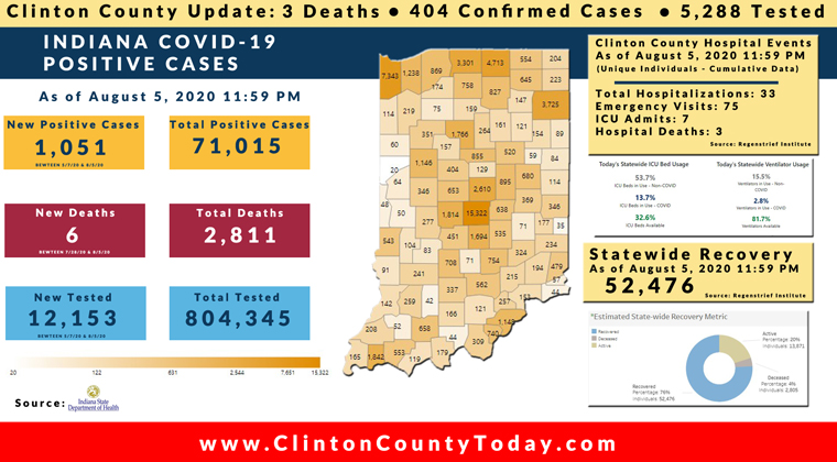 The Indiana State Department of Health (ISDH) announced today Thursday, August 6, 2020, Clinton County has had 404 residents test positive for COVID-19. There are 3 deaths related to COVID-19 in Clinton County. At least 5,288 residents of Clinton County have been tested as reported by the ISDH.