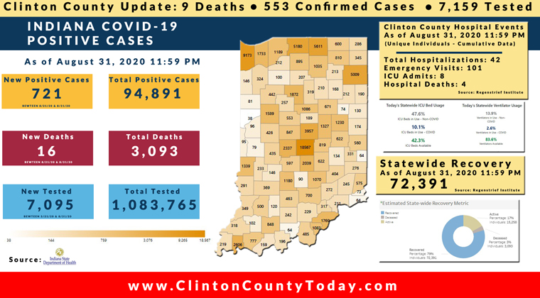The Indiana State Department of Health (ISDH) announced today, Tuesday, September 1, 2020, Clinton County had 2 new positive tests, 553 residents have now tested positive for COVID-19. There are 9 deaths related to COVID-19 in Clinton County. At least 7,159 residents of Clinton County have been tested as reported by the ISDH.