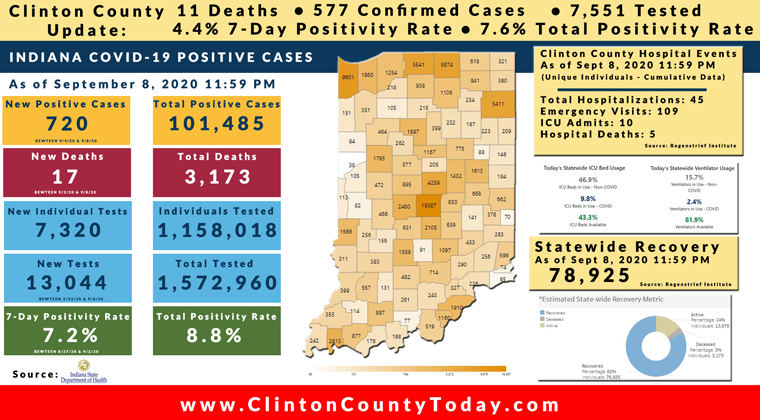 The Indiana State Department of Health (ISDH) announced today, Tuesday, September 9, 2020, Clinton County had 2 new positive tests, 577 residents have now tested positive for COVID-19. There are 11 deaths related to COVID-19 in Clinton County. At least 7,551 unique tests have been administrated to residents of Clinton County as reported by the ISDH.