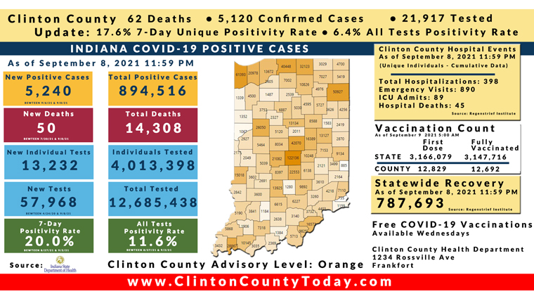 INDIANAPOLIS, Ind. – The Indiana State Department of Health (ISDH) announced today, Thursday, September 9, 2021, Clinton County had 9 residents test positive for COVID-19, 5,120 residents in total have tested positives for COVID-19. There are 62 deaths related to COVID-19 in Clinton County. At least 81,977 total tests have been administered to residents of Clinton County, of which 21,917 have been unique tests as reported by the ISDH.